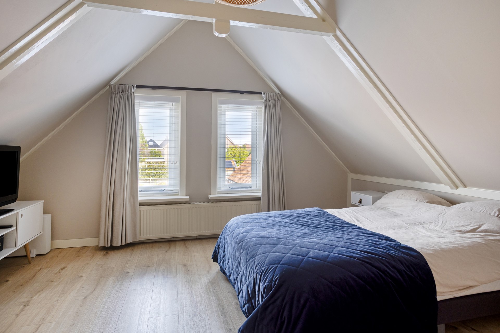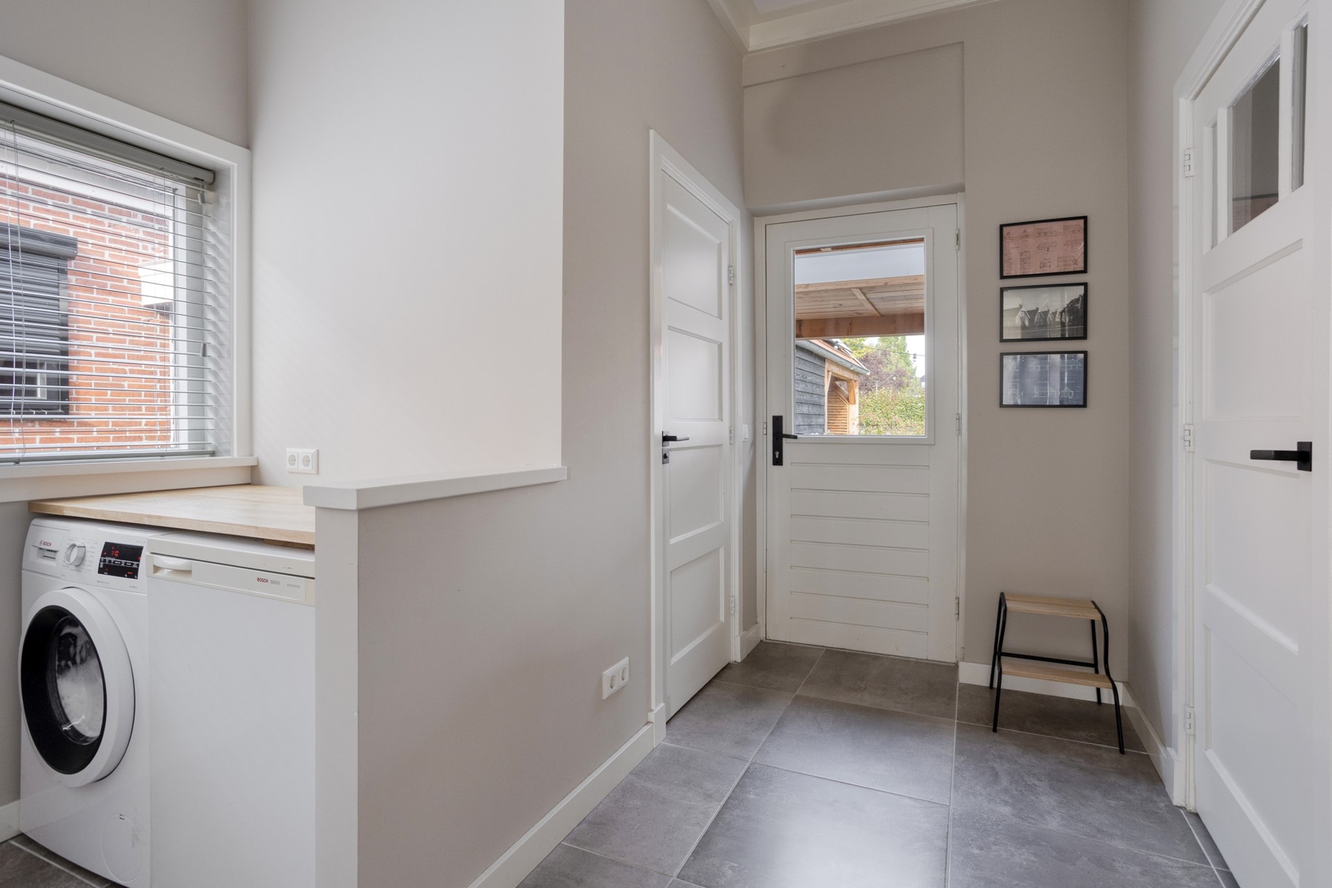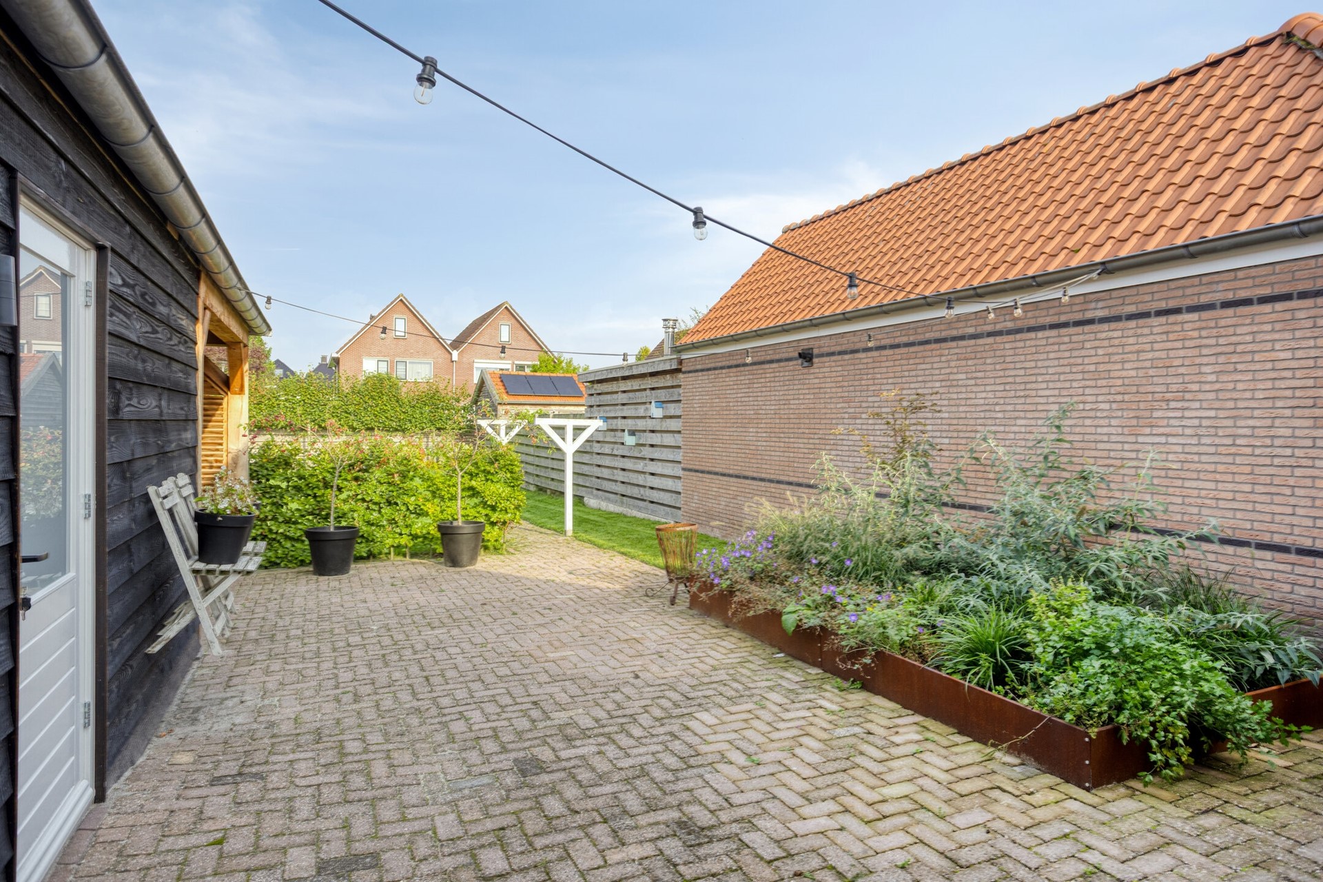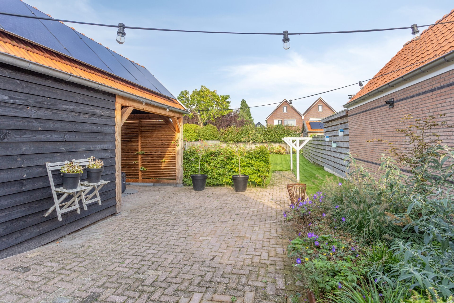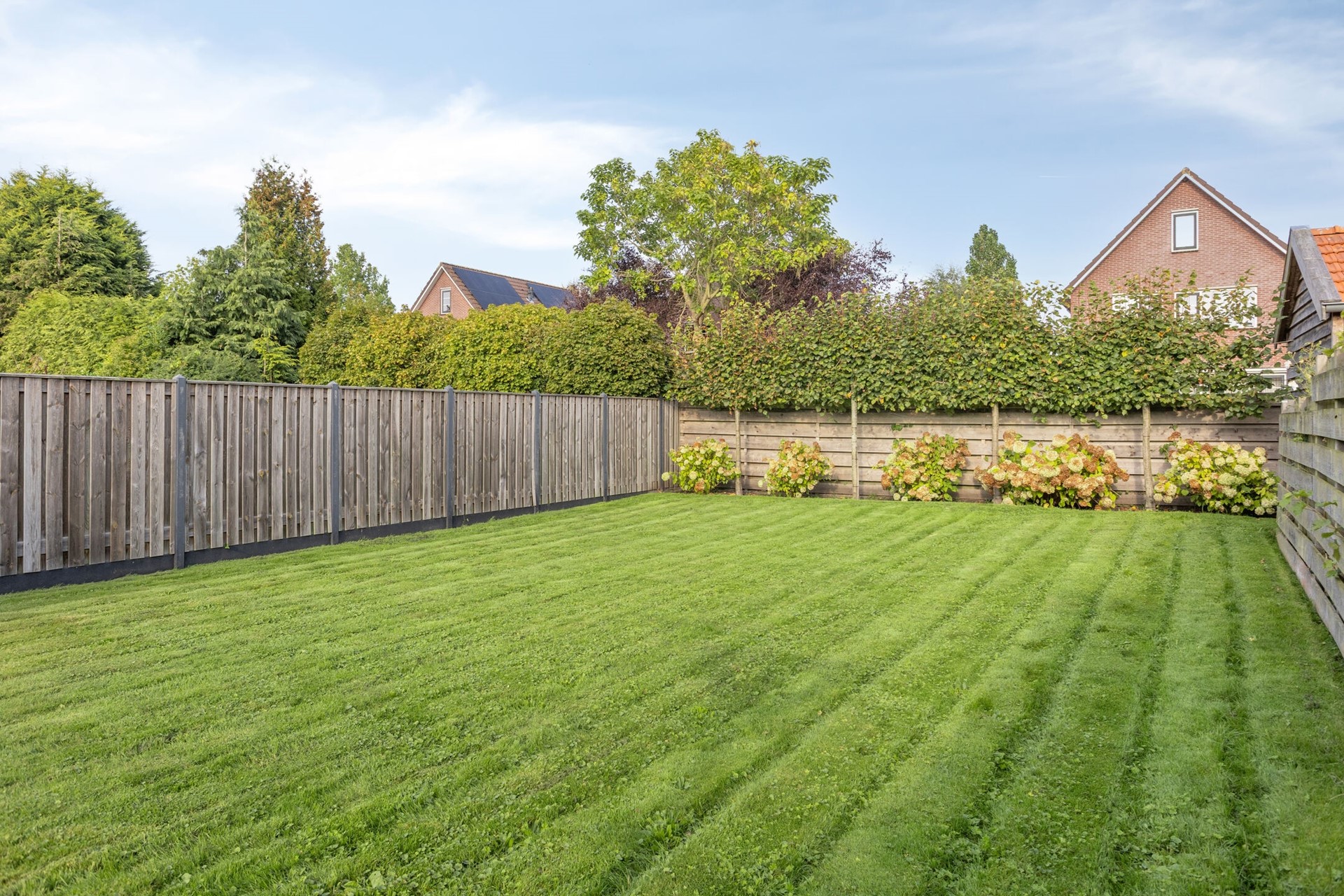 De achtertuin is lekker ruim, en aan de achterkant van de woning vind je een ruime overkapping.