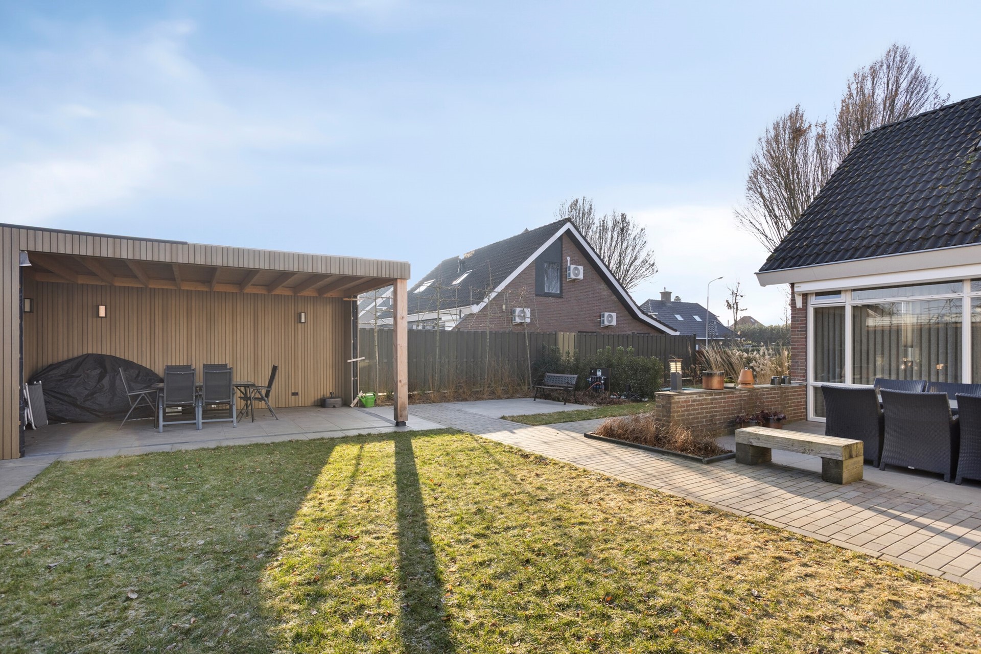 Onlangs mooi aangelegde tuin rondom met grote overkapping.